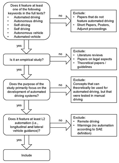 Papers that did not feature AD represented by at least one of the keywords, as well as short papers, posters, and adjunct proceedings [62], were excluded in this step. For the remaining papers, the next step in the selection process consisted of examining whether the papers’ objective was an empirical study to discard other literature reviews, as well as juridical, theoretical, or ethical papers [11,63,64]. The subsequent step of the decision tree aimed at the actual primary focus of the empirical papers. If this was not research and development of AD, the respective paper was excluded from further analysis. This step was incorporated to rule out work on concepts that, in principle, could be used for the development of AD, but was not originally investigated with that purpose [65]. In the last step of the selection process, we took a closer look at the levels of automation [1] that were investigated. The level of mere driver assistance (Level 1) as well as concepts which do not count as driving automation according to SAE definition [66,67] were out of scope for this literature analysis. Thus, only papers examining L2 and/or higher levels of automation (i.e., simultaneous lateral and longitudinal vehicle control) were included.