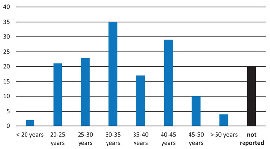 Study participants’ mean age in the most papers is below 40 years (n = 98), and only a few papers report higher mean ages such as Frison et al. [73], who in particular invited participants older than 65 to investigate acceptance of AVs in comparison with participants of younger age (see Figure 4). In 12.42% (n = 20), participants’ age is not reported.