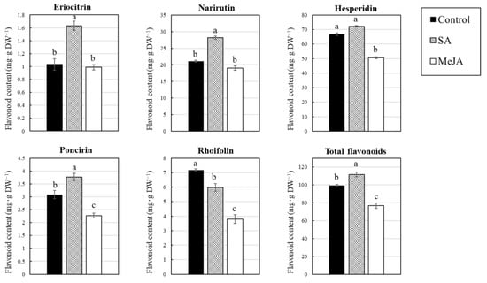 Effect of salicylic acid (SA) and methyl jasmonate (MeJA) treatments on the flavonoid content in the juice sacs of Satsuma mandarin in vitro. The total flavonoid was calculated by summing eriocitrin, narirutin, hesperidin, poncirin, and rhoifolin. Columns and bars represent the means and SE (n = 3), respectively. Different letters indicate significant differences at the 5% level by Tukey’s HSD test.