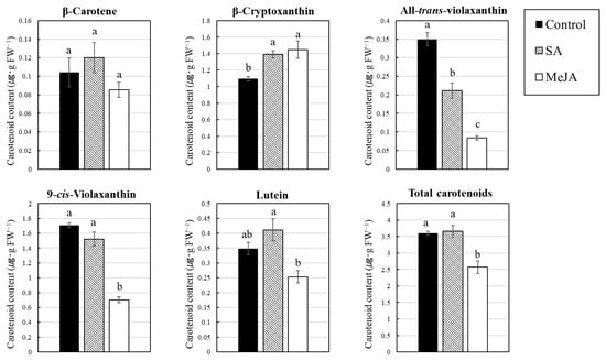 Effect of salicylic acid (SA) and methyl jasmonate (MeJA) treatments on the carotenoid content in the juice sacs of Satsuma mandarin in vitro. The total carotenoid was calculated by summing β-carotene, β-cryptoxanthin, all-trans-violaxanthin, 9-cis-violaxanthin, and lutein. Columns and bars represent the means and SE (n = 3), respectively. Different letters indicate significant differences at the 5% level by Tukey’s HSD test.