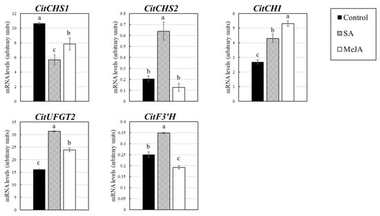In the present study, to investigate how salicylic acid (SA) and methyl jasmonate (MeJA) treatments regulate flavonoid and carotenoid accumulation in the juice sacs of citrus fruit, we set up an in vitro system []. In the in vitro system, the juice sacs were cultured on MS medium supplemented with SA or MeJA, and the environmental conditions, such as light, water stress, and temperature were identical among the treatments. We evaluated the effects of plant hormones (abscisic acid and gibberellin), different colors of LED lights (blue and red), water stresses (sucrose and mannitol), and temperatures on carotenoid and ascorbate accumulation in the juice sacs of citrus fruit using this in vitro system [,,,]. In the present study, to elucidate the regulation of carotenoid and flavonoid metabolisms in response to SA and MeJA treatments in citrus fruit, the effects of SA and MeJA on carotenoid and flavonoid accumulation and the expression of genes related to carotenoid and flavonoid biosyntheses were investigated in the juice sacs in vitro. The results presented in this study provide new strategies to promote the accumulation of flavonoid and carotenoid and improve the quality of citrus fruit.