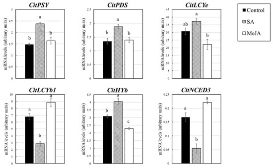 The effects of SA and MeJA on the accumulation of the major carotenoids in the citrus juice sacs were also investigated. Although significant change in the total carotenoid content was not observed, the accumulation of individual carotenoid, such as β-cryptoxanthin and all-trans-violaxanthin, was affected by the SA treatment (Figure 2). Indeed, the content of all-trans-violaxanthin decreased, while that of β-cryptoxanthin, which accounts for about 30% of total carotenoid, increased after the SA treatment. On the contrary, the total carotenoid content was much lower than the control after the MeJA treatment. In particular, only the content of β-cryptoxanthin increased up to 0.24-fold with respect to the control; whilst the concentration of all-trans-violaxanthin, 9-cis-violaxanthin, and lutein significantly decreased (Figure 2).
