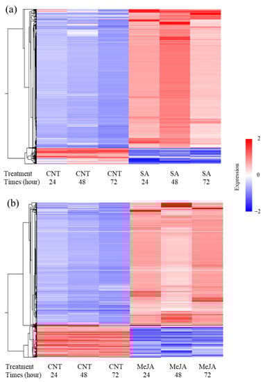 Hierarchical cluster analysis of 1616 salicylic acid-responsive genes and 4914 methyl jasmonate-responsive genes with more than 2-fold expression changes between salicylic acid or methyl jasmonate and control treatments. (a) Salicylic acid (SA)/control (CNT) signal intensity ratio; (b) Methyl jasmonate (MeJA)/control (CNT) signal intensity ratio. The color scale indicates a signal intensity of each gene. Tree at the left side of the matrix represents gene relationship.