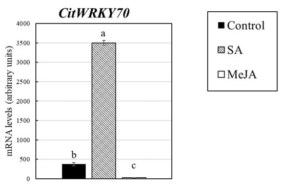 Effects of salicylic acid (SA) and methyl jasmonate (MeJA) treatments on the expression of CitWRKY70 in the juice sacs of Satsuma mandarin in vitro. The mRNA levels were analyzed by TaqMan real-time RT-PCR, and the expression of 18S ribosomal RNA (rRNA) was used as a control to normalize the raw data. Columns and bars represent the means and SE (n = 3), respectively. Different letters indicate significant differences at the 5% level by Tukey’s HSD test. WRKY70, WRKY DNA-binding protein 70.