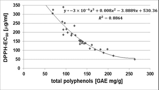 The DPPH-EC50 values of all studied extracts were correlated with their TPC values, deriving a polynomial function, where greater TPC and lower DPPH-EC50 denote higher antioxidant activities (Figure 1).