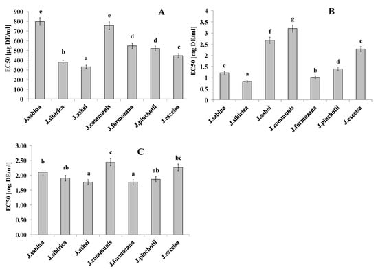 Antioxidant activity of extracts from leaves of previously selected juniper representatives. (A)—antiradical activity against 2,2′-azino-bis(3-ethylbenzthiazoline-6-sulphonic acid (ABTS), (B)—chelating power, (C)—ability to lipoxygenase inhibition. Standard deviation (SD) is shown as error bars. Values (±SD) with different letters (a–g) are significantly different at p < 0.05.
