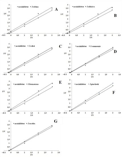 Mode of lipoxygenase (LOX) inhibition by extracts from leaves of previously selected juniper representatives. (A) J. sabina, (B) J. sibirica, (C) J.ashei, (D) J. communis, (E) J. formozana, (F) J. pinchotii, (G) J.excelsa. V—rate of enzymatic reaction expressed as the absorbance unit (see methodology), S—the substrate concentration (see Methodology).