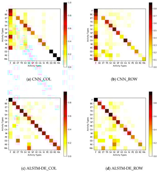 Heat maps of activities for the models. Since it is an unbalanced dataset, we have performed column-wise normalization (COL) and row-wise normalization (ROW) on the original heat maps. The values on the diagonal of “COL” correspond to precision score, and the values on the diagonal of “ROW” correspond to recall score.