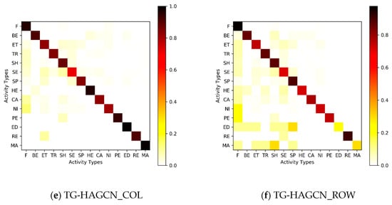 Comparatively, the proposed model captures the network structure (interaction) between nodes and edges by exchanging features with their neighbors in training process. In this way, the samples in each category are not trained independently any more, hence, achieving best Mac accuracy in those models. In addition, the TG-HAGCN model has enough features from interactions to make accurate activity classification in a small dataset. Besides, the model performs well in the recognition of activity types in the unbalanced dataset. The results suggest that interactions and date information can supplement additional information, and this information together with methods to fuse them should be considered on improving the model performance in related works.