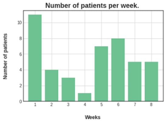 The distribution of the 190 dental selfies—shows the number of participants per length of participation in our pilot study (number of weekly selfies sent using the app).