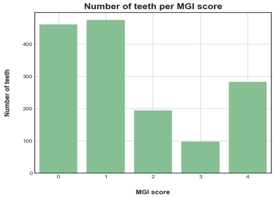 Showing the distribution of MGI scores received by our 1520 single-tooth images. Our dataset included: 471 images rated 0 = healthy—no inflammation; 475 rated 1 = mild inflammation; 195 rated 2; 98 rated 3; 283 rated 4 = severe inflammation.