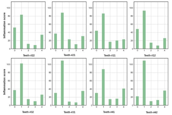 Our method uses a classifier per tooth per stage. The results of our lower teeth classifiers achieved higher accuracy than those for the upper teeth. In addition, lateral incisor classifiers were more accurate than central incisor classifiers. These results demonstrate the reliability of our method, since they correlate with clinical dental findings that the gums of the lower teeth tend to show inflammation and escalation first, due to proximity to the salivary glands and poor brushing technique [33].