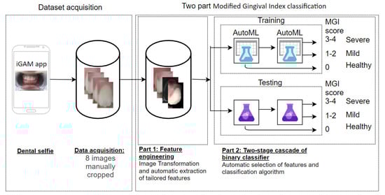 Overview of the method described in the paper. Dataset acquisition: eight single tooth images manually cropped from each dental selfie taken by iGAM users. Fed into two-part classification method: part (1) image transformation and feature engineering—extraction of features tailored to dental images; part (2) two-stage cascade of binary classifiers—Healthy/Unhealthy, Mild/Severe.