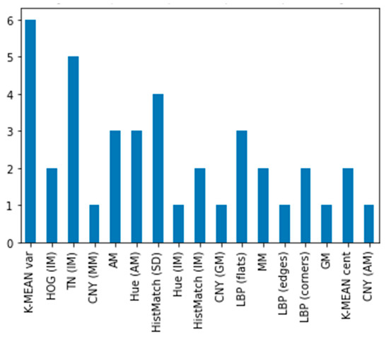 As to the feature selection, we focused on a set of 35 features extracted per image, chosen specifically with the characteristics of our dental tooth images in mind (wide variability in lighting, perspective, cameras, and other qualities, with underlying similarity in content). The analysis by AutoML-H2O found the most contributing features for each of the classifiers (see Figure 9 and Figure 10). Note that our innovative feature tailored to the dental context—TN (IM)—was selected by AutoML-H2O for the most cases 5/8 positions at the first stage, and 7/8 at the second stage, proving its value.