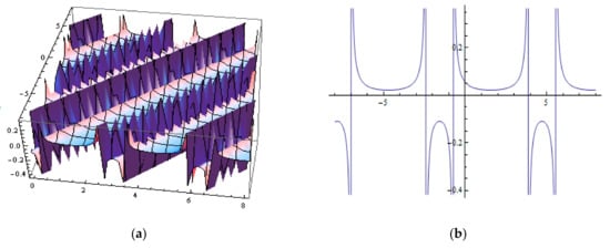 They are many methods to solve nonlinear partial differential equations (NPDEs) such as transformed rational function (TRF) method [] and the multiple exp-function (MEF) method [,]. The RSSM is one of the important applications to the TRF method and MEF methods for solving the NPDEs. The transformation in Equation (2) is applied to transfer the NPDEs to NODEs. We suppose the solutions of the NODEs according to the RSSM have the shape