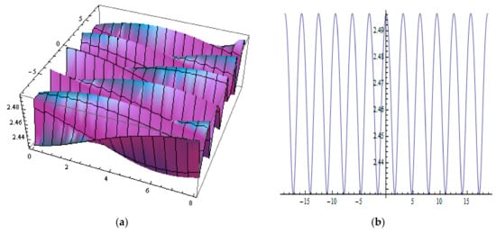 In this section we plot the two- and one-dimensional solutions when the parameters take some suitable values to determine the type of the optical solutions. We show the effect of the parameter q in the q-deformed functions in optical solutions. We plot the absolute value of the complex exact solution to discuss the amplitude of the soliton solutions. In Figure 1, we plot the traveling wave solution (17) when the parameters take the values and . We get a singularity at x = −1.4 when the velocity of solion is equal to 2 and the wave number is 4; consequently the soliton solution in Equation (17) is the singular soliton solution while in the Figure 2, the soliton solutions in Equation (18) is periodic singular solution. Figure 3 presents the exact solution of Equation (59) when is the bright soliton equations while the exact Equation (80) in the Figure 4 is dark soliton equations. Figure 5 illustrates the periodic soliton Equation (119) when .