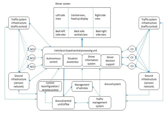 - proactive management—top management that uses the results of predictive simulations (on the possible occurrence of the traffic jam caused by accident, weather changes, demonstrations) as feedforward, or internal model control, as well as using free routes for prioritized vehicles or simulating the vehicle motion in exceptional environmental cases.