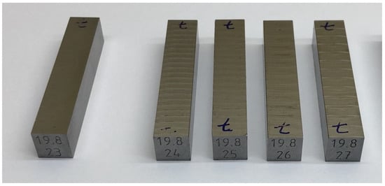 Five samples were fabricated from 22NiMoCr37 nuclear reactor pressure vessel steel material. Specimens have the standard Charpy sample dimensions (10 × 10 × 55 mm3). Different surface roughnesses were produced by applying various manufacturing parameters such as the primary (spindle RPM) and secondary (feed rate) machine cutting forces. The obtained surface roughness was characterized where specimens had an L-T orientation. Longitudinal direction is parallel to the length of the sample. The investigated samples are shown in Figure 1. Manufacturing parameters and surface roughness parameters of the measured samples are shown in Table 1. A reference sample (stamped 23, on the left side of Figure 1) represents the surface manufacturing condition for normal inspection parameters of RPV (in the field conditions) steels. For the samples labelled 24–27, the surface roughness is different. The surface condition can be seen in better detail in Figure 2 (plan view).