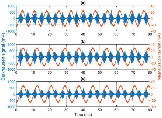 Output signal was measured by a 50-turn pick-up coil, wounded around a yoke leg. A specially designed permeameter [17] was used during measurement. Therefore, the obtained triangular like waveform is composed by two linear sessions having the same slew-rate but with opposite signs, considering the whole cycle of the reverse-magnetization. In addition, the final (i.e., peak) level of the reached current in each half-period increased by fixed step, where the direction of magnetization is reversed, in order to be able to record concentric minor magnetization loops. These two things in combination result in the triangular like waveform can be seen in left side of Figure 3. Therefore, instead of describing the frequency spectrum of the exciting signal, the “speed” of magnetization can characterize the difference between the two triangular like waveforms are used for the comparison in this paper.