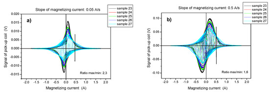 The permeability loops, measured by the MAT method on samples 23–27, are shown in Figure 5a,b with the slope of the magnetizing current being 0.05 and 0.5 A/s, respectively. Changing the speed of the magnetization obviously has an effect on the recorded permeability loops. However, the surface roughness alters the obtained curves in different ways: the ratio of maximum permeability (reference sample/sample having largest surface roughness) is different for these two “speeds” of measurement. The maximal permeability was determined simply as the peak value of permeability loops, shown in Figure 5a,b.