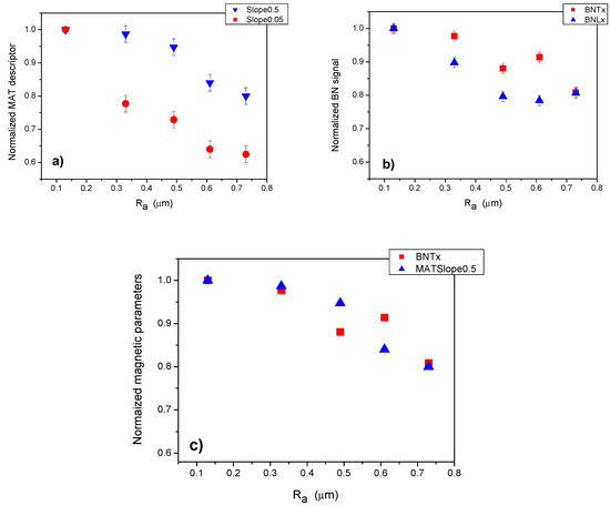 It is an important observation that by increasing the speed of magnetizing current, the dependence of MAT descriptors on the surface roughness parameter can be reduced. This result is new, compared with previous measurements. In short, if we focus on the determination of the surface roughness itself, slow measurement should be applied, while if we are interested in detection of material changes due to any type of degradation, faster measurement is preferred approach. It is worth mentioning that by using fast MAT measurement up to a certain value of surface roughness (about Ra = 0.35 μm), the influence of surface roughness on the magnetic descriptor is almost negligible, in spite of the fact that in permeability loops, especially considering their peak values, the difference is clearly seen (see Figure 6). This fact can also be observed in the case of MBN measurements, with reference to the transversal measurements (see Figure 7). The good correlation between MAT and MBN measurements is encouraging.