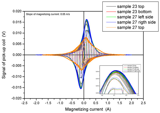 The samples shown in Figure 1 were measured by MAT method. For the measurement, a magnetizing yoke was put on the surface of the sample. The size of the yoke was chosen to fit the size of samples: cross-section 10 mm × 5 mm, total outside length 18 mm. A triangular waveform of magnetizing current, led into the 100 turns of the magnetizing coil, wounded on the bow of the yoke was applied with step-wise increasing amplitudes and with a fixed slope magnitude in all the triangles. Such a way a triangular time-variation of the effective field, ha(t), is produced in the magnetizing circuit and a signal is generated in the pick-up coil. ha(t) sweeps linearly with time, t, and the voltage signal U(ha,hbj), in the pick-up coil is proportional to the differential permeability, μ(ha,hb), of the magnetic circuit.