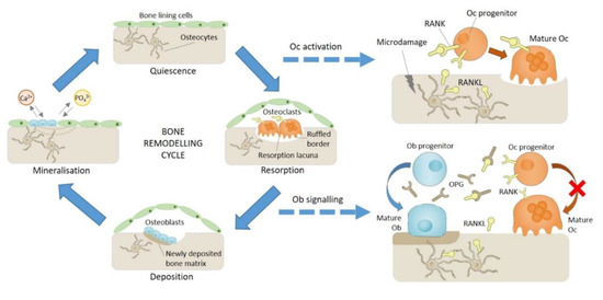 Schematic representation of the bone remodelling process [18]. Legend: osteoblasts (Ob); osteoclasts (Oc); receptor activator of nuclear factor-ĸΒ (RANK); receptor activator of nuclear factor-ĸΒ ligand (RANKL); osteoprotegerin (OPG).