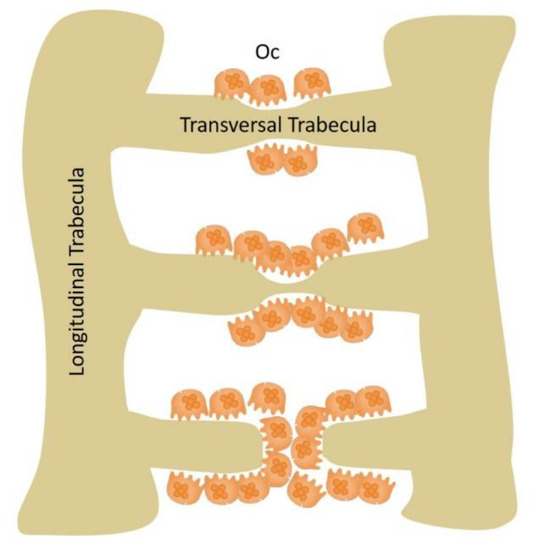 The mechanism underlying the loss of trabecular interconnection is still matter of debate. A potential explanation was provided by Parfitt and collaborators [27,28], stating that this loss can be caused by the superior rate of osteoclastic resorption in osteoporotic bone, leading initially to the perforation of the trabeculae and successively to their complete removal, as schematised in Figure 2.