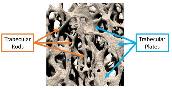 Trabecular bone is composed of numerous plate-like and rod-like trabeculae that arrange themselves according to the applied mechanical stress; their relative proportion depends on the bone site (Figure 3). In general, plates align along the longitudinal axis of bone and sustain most of the load, while rods are disposed along the transverse plane and act as links to stabilise the structure [29].