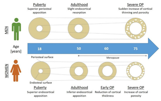 Besides the variations in the trabecular bone tissue, OP occurrence also causes a reduction of cortical thickness due to the increased endosteal bone resorption not counterbalanced by a periosteal apposition, as shown in Figure 4. The cortical thinning is particularly evident in females because, compared to males, the amount of deposited bone in the periosteal surface is significantly lower [24]. With the disease progression, OP causes an increase in the cortical porosity and consequently in the cortical surface area, since the internal surface of the new pores can also be affected by the unbalanced remodelling process. The result is the acceleration of the process of cortical bone loss [2].