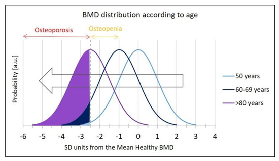 Bone mineral density (BMD) distribution in women at different ages. In purple is reported the area of osteoporosis prevalence according to WHO criteria. Legend: arbitrary unit (a.u.). Image adapted from Dimai et al. (reproduced with permission from [41], Elsevier, 2017).