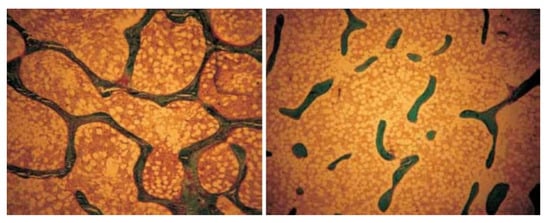 Histomorphometric images of a portion of trabecular bone of a healthy postmenopausal woman (left) and of a woman affected by postmenopausal osteoporosis (right) [51]. The reduction in the trabecular bone volume is evident. This image is licensed under a Creative Commons Attribution–Non-Commercial 4.0 International Licence.