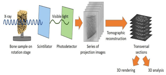 Computed tomographic (CT) imaging techniques allow for assessing the 3D bone organisation by irradiating the bone with an X-ray beam along different directions and by detecting the transmitted radiation. Since the attenuation of the X-ray beam depends on the density of the material crossed, the intensity profile of the revealed radiation contains the compositional information of the bone structure along the analysed direction. Thanks to specific reconstruction algorithms, the radiation profiles along the several directions are integrated in order to generate greyscale images of the bone structure, whose grey shades depend on the bone composition. Successively, these images are elaborated to perform morphometric and densitometric analyses on the scanned bone sample.