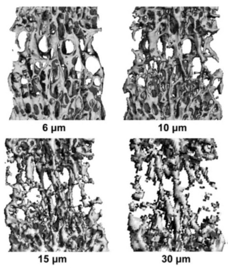 - Palacio-Mancheno, P.E.; Larriera, A.I.; Doty, S.B.; Cardoso, L.; Fritton, S.P. 3D assessment of cortical bone porosity and tissue mineral density using high-resolution μcT: Effects of resolution and threshold method. J. Bone Miner. Res. 2014, 29, 142–150. [Google Scholar] [CrossRef]