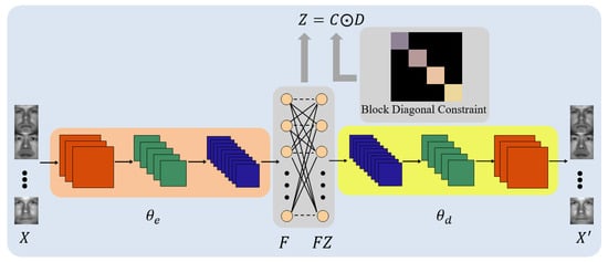 Architecture of the proposed Deep Subspace Clustering with Block Diagonal Constraint (DSC-BDC). It consists of mainly three modules: (a) the convolutional encoder module is used to extract convolutional features, and the parameter is marked as ; (b) the convolutional decoder module is used with the encoder module to initialize the convolutional module, and the parameter is marked as ; and (c) the self-expression module with indirectly block diagonal constraint is used to learn a better representation matrix from the self-expression coefficients, by applying a separation strategy to the representation matrix.