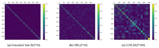 Visualization of the representation matrices based on Extended Yale B, ORL and COIL20. For the convenience of observation, for different database, we multiply the Z by 10, 10 and 100, respectively.