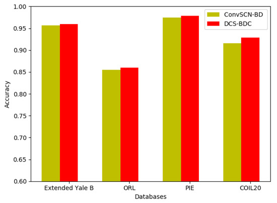 For visually intuition, we show the corresponding derived representation matrix, as a clearer block diagonal structure of the representation matrix results in higher clustering performance. We show the three databases (Extended Yale B, ORL and COIL20) in Figure 2. Clearly, the representation matrix Z has apparent block diagonal structure. We next explore the advantages of the method using the separation strategy (DSC-BDC) over the method without the separation strategy (ConvSCN-BD). We plot the accuracy of different databases in Figure 3. This implies the effectiveness of the separation strategy.