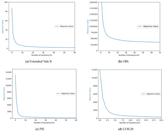 For all databases, the kernel size in convolutional layers is set to 3 × 3. For Extended Yale B database, we set the channels as 20. In the fine-tuning stage, we set , , , and and run 450 epochs for DSC-BDC. For ORL database, we set the channels as 3–3–5–5–3–3. In the fine-tuning stage, we set , , , , and . In addition, for PIE database, we set the number of channels to 20 and set , , , , and . On COIL20 database, the number of channels is 15, and the parameters are consistent with PIE databases except that .