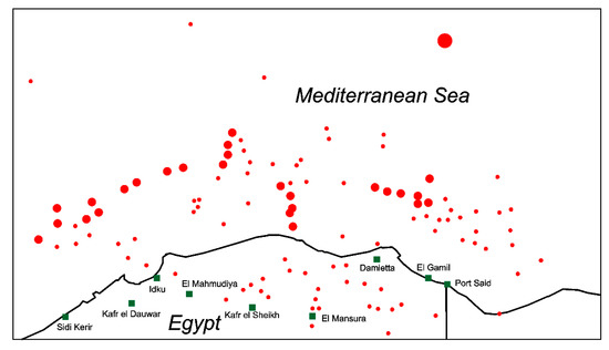 Gas fields in Northern Egypt, mostly offshore, redrawn according to [20,22].