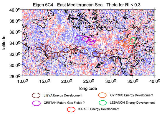 This can mean two things: (1) this new method truly navigates to new places with potential TD. However, (2) it is good to recall here the axioms from Section 2.2 explaining that the combed θ do not automatically mean that the deposits exist there, and correlation does not mean causation. The combed θ generally provide information about changed porosity but the reasons for this are diverse and mean various things (for example, groundwater). Figure 12, for example, shows highly combed areas of θ (I < 0.3) in regions of Egypt, Israel, Jordan, Saudi Arabia, Lebanon, Cyprus, regions of Turkey and Saudi Arabia, and the Eastern Mediterranean. All these places are candidates with potential TD.