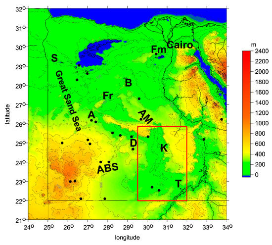 Where we are in Egypt: topography from ETOPO 1 together with the names of important places to introduce the area of our study: A Abu Minqar, ABS Abu Ballas Scarp-land, AM Abu Muhariq (Limestone) Plateau, B Bahariya, D Dakhla, Fr Farafra, Fm Faiyum, K Kharga, S Siwa, T Wadi Toshka. Red rectangle: the area of Kharga-Toshka (TK), evaluated in this study (Section 4.3). Black dots: areas with archaeological evidence falling within the maximum expansion of the Holocene occupation based on [24] (their figure 3c).