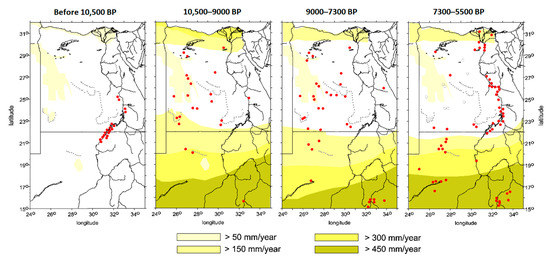 Climate-controlled occupation in the Eastern Sahara during the main phases of the Holocene after [24] (their figure 3a–d). With the abrupt arrival of monsoon rains ~10,500 BP, the hyper-arid desert to the west of the Nile was replaced by savanna-like environments, while the Nile Valley was too moist for occupation. After ~7300 BP, desiccation of the Egyptian Sahara began again. Redrawn following the data from [24].