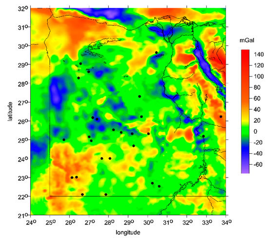 The archaeological localities (black dots) over the map with the gravity disturbances Δg (mGal) from EIGEN 6C4: the positions of archaeological sites of the Holocene occupations between ~10,500 and ~7300 BP in the Eastern Sahara, Western Desert of Egypt, were utilized (after [24]).