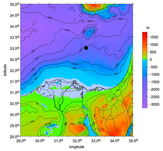 The surface topography in our area of interest (from ETOPO 1 model in (m)). The large black dot is for Zohar.