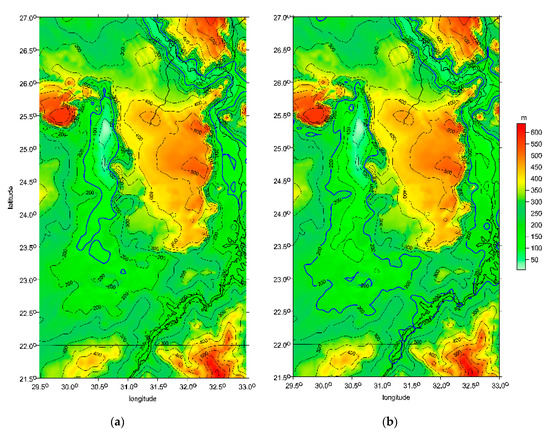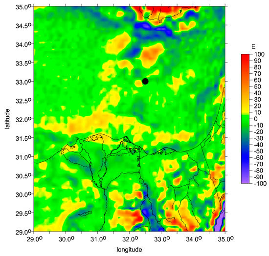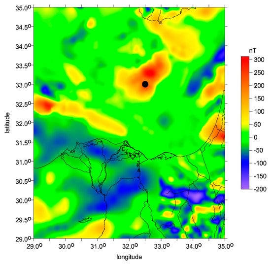 The magnetic anomalies—the values of magnetic induction (in nanotesla [nT]) as an additional informative source to the gravity data/aspects—are taken from the worldwide model EMAG 2 [18]. This is a global 2’ resolution grid compiled from satellite, marine, aeromagnetic and ground surveys. It has a ground resolution of 5–10 km (depending on the location). We also tested EMAG 3 (with a lower resolution) but without effect for Egypt. Some parts of Egypt (central and southern areas) are without any data in the EMAGs.