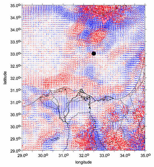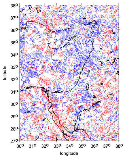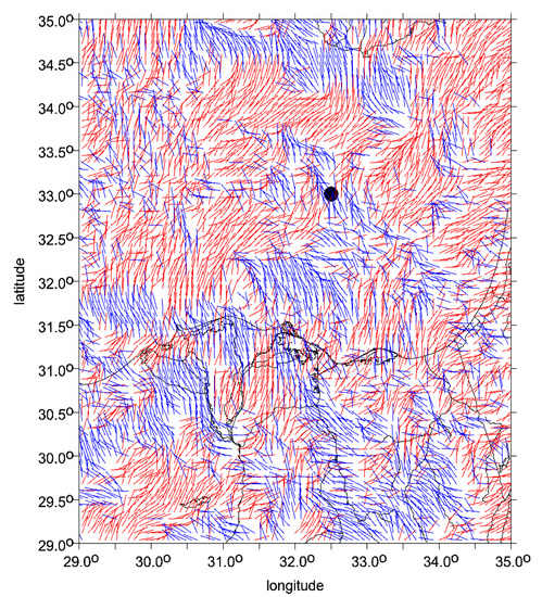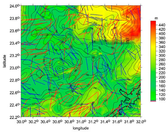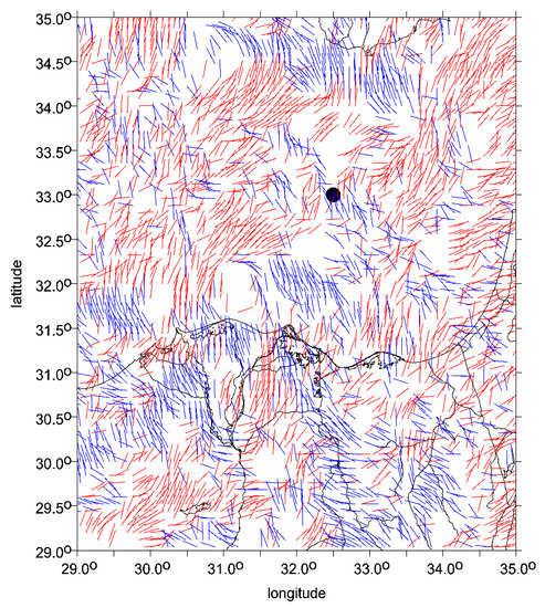The maps with oil and gas deposits (Section 2.4.3) were plotted together with the strike angles θ (Figure 15a–d) for the Nile delta, Mediterranean Sea, Suez/Sinai/Red Sea and Western Egypt near Siwa to determine whether and how much the combed θ correlate with the locations of known TD. They correlate well in all locations that we tested: any larger deposit of TD is marked by the combed θ. This is a positive finding. Somewhat disquieting is the fact that they correlate on many further places, often close to or being a “continuation” of known deposit sites, but the combed strike angles are also on many other places separated from known digging spots.