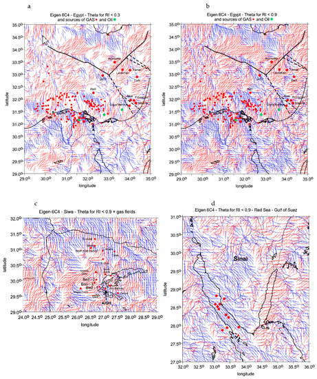 (a,b) The combed θ [deg] for (a) I < 0.3 and (b) I < 0.9 for gas (red dots) and oil (green dots) known and already used localities in the Nile delta and the Mediterranean Sea as far north as Zohar. (c,d) The combed θ [deg], I < 0.9, known and already used deposits (triangles show localities in preparation) for Western/Northern Egypt near Siwa (c) and for Suez/Sinai (d).