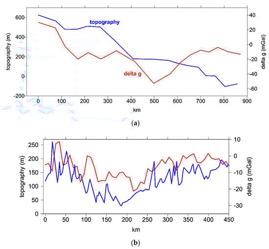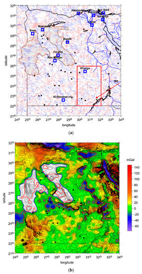 (a,b) The profiles of ETOPO 1 topography (blue) and gravity disturbances Δg according to EIGEN 6C4 (red): (a) GSS from Gilf Kebir to Siwa and (b) from Kharga to Toshka.