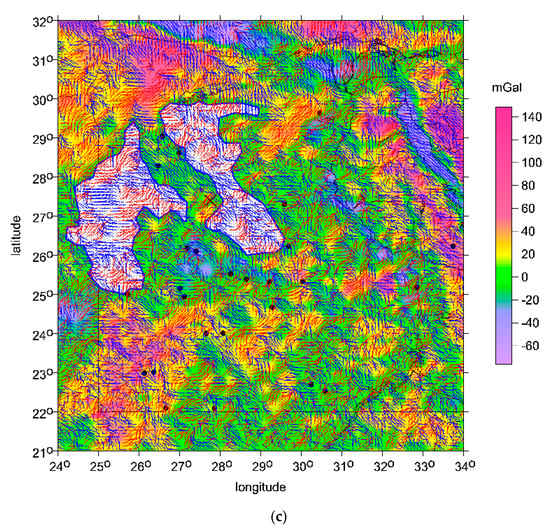 We have tested an experimental XGM2019e gravity field model [17], which, however, must produce results similar to those from EIGEN 6C4 owing to the similar database. XGM2019e might be slightly better over the oceans due to the additional measurements likely provided by altimetry satellites. There is a version of XGM2019 to d/o ~2190 (with the ground resolution ~9 km), the same as EIGEN 6C4, and another version up to d/o = 5399 (the resolution ~4 km); we used both for a comparison. It is impossible to guarantee that some of the fine features shown by these gravity models are not just artefacts caused by noise [17]. For Egypt, we did not find any observable difference in most of the gravity aspects, but we observed a total failure in the strike angles. The reason is not yet known, but it may be due to altitude difference as the gravity field changes rapidly from the surface sources. Therefore, we continue to work only with the EIGEN 6C4 model; we count with the ground resolution ~10 km and estimate of the external accuracy not more than 10 mGal (Ch. Förste, priv. commun.).