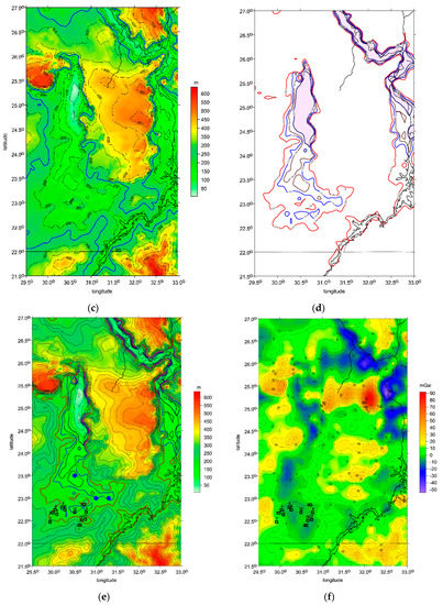 (a–d) The ETOPO 1 with selected contour lines for the heights 150, 200 and 250 m asl (a–c). We recall that the estimated external accuracy in the heights in the ETOPO 1 model is ±20 m. The last figure (d) shows only the selected contour lines at 200, 170, 150 and 120 m asl (red for 200 m, pink for 120 m). (e,f) The position and extent of the huge hypothetical paleolake(s) between Kharga and Toshka, Southern Egypt (TK), versus ETOPO 1 topography and Δg (EIGEN 6C4). The squares show archaeological sites from Table 1. The blue dots on (e) are for the main modern Toshka lakes (or their present remnants).